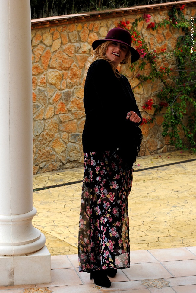 Tenía muchas ganas de enseñaros este look, especialmente el sombrero tan bonito que conseguí a través del sorteo que Olga del Blog El rincón de la creación ofreció y yo tuve la suerte de ganar. Yo que no suelo ser muy afortunada en estas cosas, no me lo creía, cuando Olga me lo comunicó me hizo mucha ilusión. ¡ Gracias otra vez! Llegó a casa y no esperé para estrenarlo, es uno de los complementos que más me gusta llevar y en este color me pareció ideal para combinar con este vestido de estampado floral. Un toque lencero, flecos y botas altas componen este look con aire bohemio.